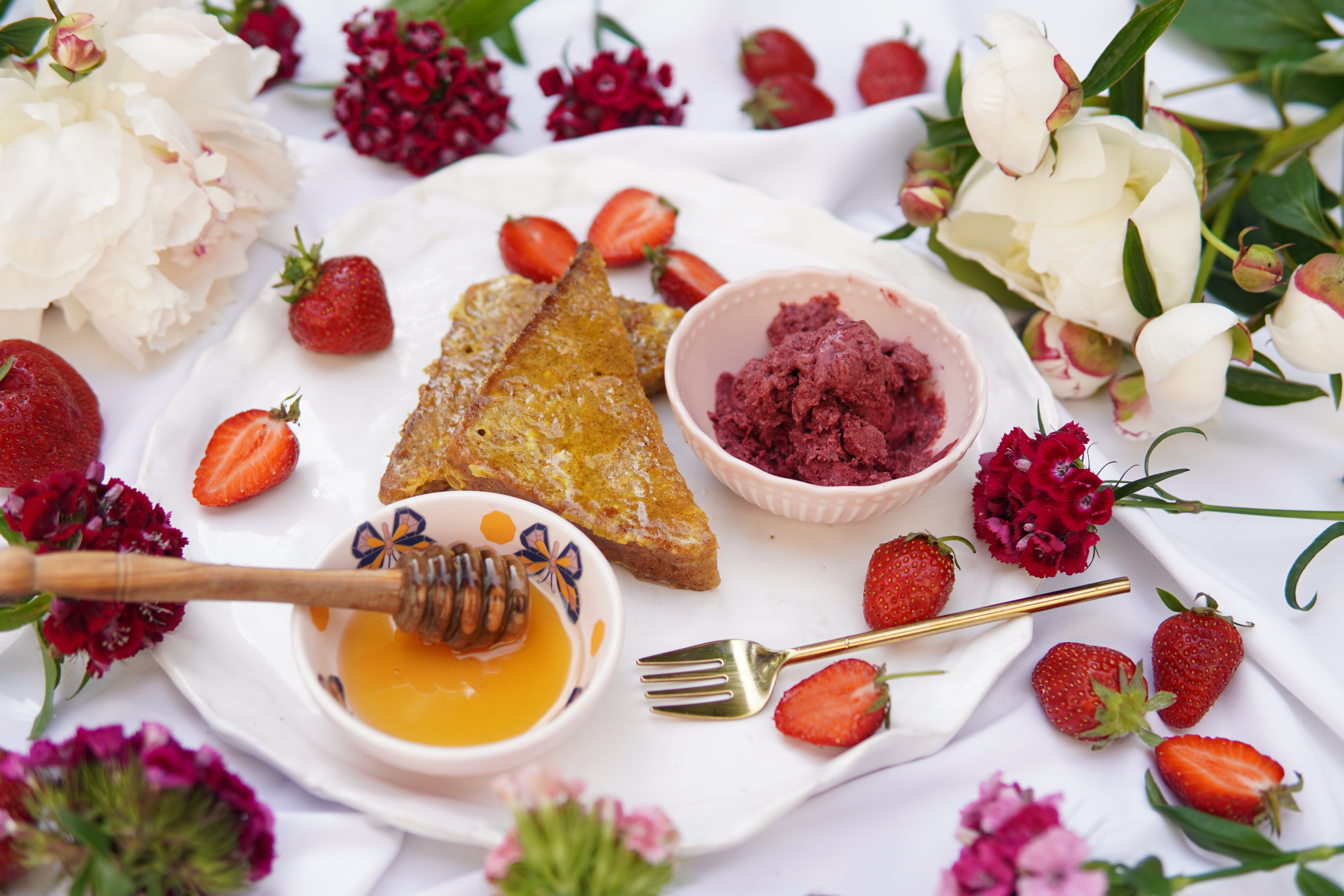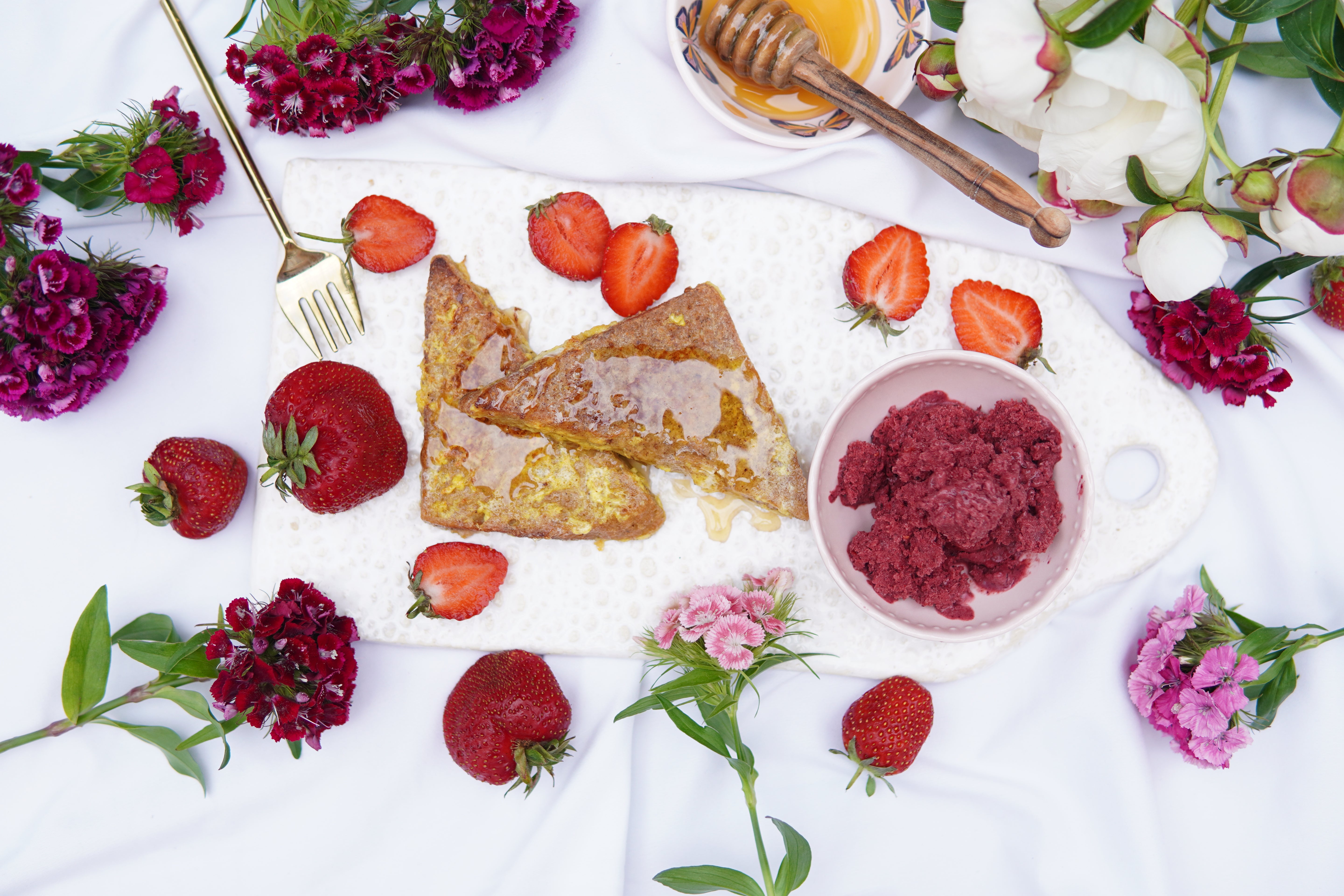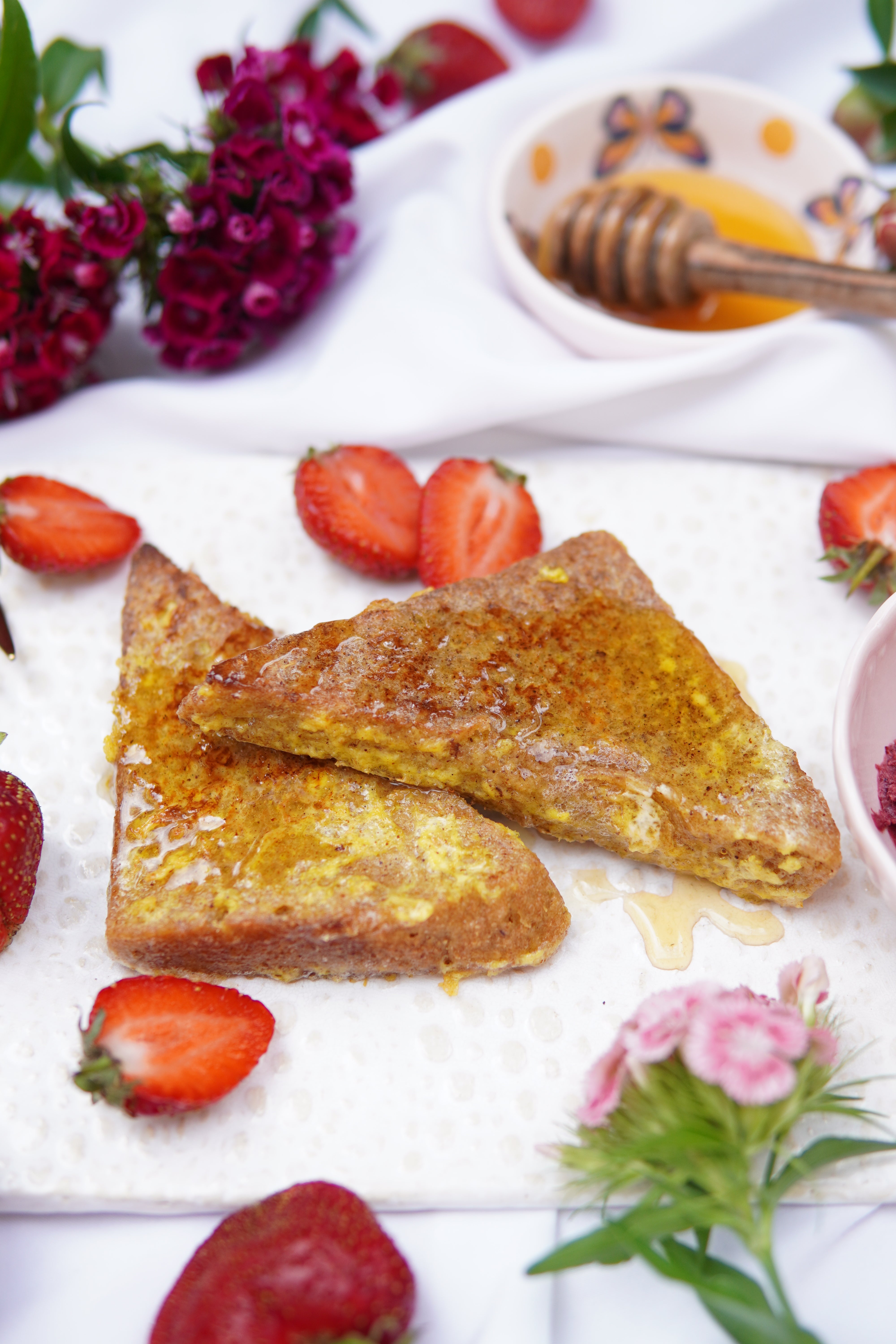 Die Basis dafür muss natürlich ein selbst gebackenes, vollwertiges Kefir-Toastbrot sein. Und so entstand dieser leckere French Toast mit Honig und Erdbeeren – perfekt für ein besonderes Sonntagsfrühstück.”