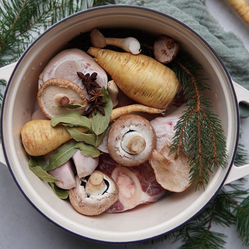 Ein paar Kleinigkeiten macht Oma Rosa anders als wir, und nicht alles an Omas Rezept ist vollwertig. Oma Rosa gibt das Gemüse eine Stunde vor dem Fleisch in die Brühe. Sie gibt ganze Karotten und große Stücke Sellerie und Lauch hinein. Sie meint, es brauche länger, bis es weich wird. Sie möchte den Geschmack und die Nährstoffe rauskochen. Wir dagegen geben das Gemüse meist erst in der letzten Kochstunde dazu und schneiden es in kleine Stückchen, so können wir es noch mitessen. Oma Rosa fischt die Karotten heraus und gibt sie in den Suppenteller, und der Rest vom Gemüse darf getrost auf den Kompost. Oma Rosa gibt in den letzten 5 Minuten abgepackte Suppennudeln dazu. Wir würden vollwertige Pasta (oder kleine Teigbatzen) aus frisch gemahlenem Getreide selbst machen. Wir haben Omas Rezept leicht abgewandelt und geben das Gemüse zumindest gleichzeitig mit dem Fleisch in den Topf, und die Suppennudeln lassen wir einfach weg. Du siehst, dass man auch Omas Rezepte ein wenig unter die Lupe nehmen darf. Denn wir müssen bedenken, dass unsere Großeltern auch im Zeitalter der Industrialisierung aufgewachsen sind. Traditionelle Ernährung bedeutet jedoch, dass wir uns weitestgehend von Fertigprodukten fernhalten und unverarbeitete Lebensmittel verwenden und somit «Clean Eating» in seiner reinsten und ursprünglichen Form praktizieren. Wenn deine Kinder die Brühe lieber mit gekaufte Pasta essen, ist es natürlich nicht verwerflich, mal einen Kompromiss einzugehen. Nun kommen wir zum Rezept für Knochensuppe nach Oma Rosa.