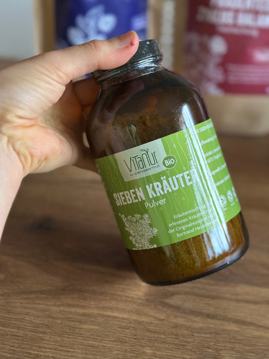Bitterkräuter Pulver (alkeholfrei) nach Bertrand Heidelberger, sieben Kräuter: Bibernellwurzel, Fenchel, Kümmel, Wacholder, Anis, Schafgarbe und Wermut.