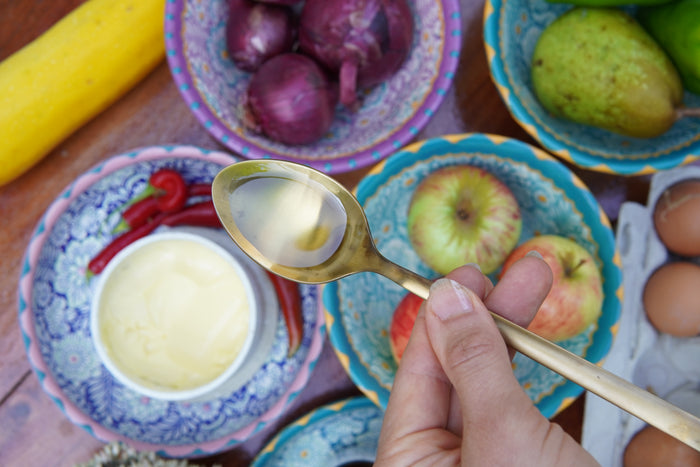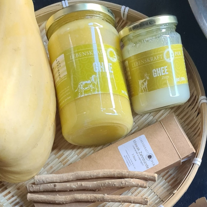 Geklärte Butter mit hohem Rauchpunkt aus Bio Kuh-oder Ziegenmilch. Zum anbraten oder frittieren geeignet.