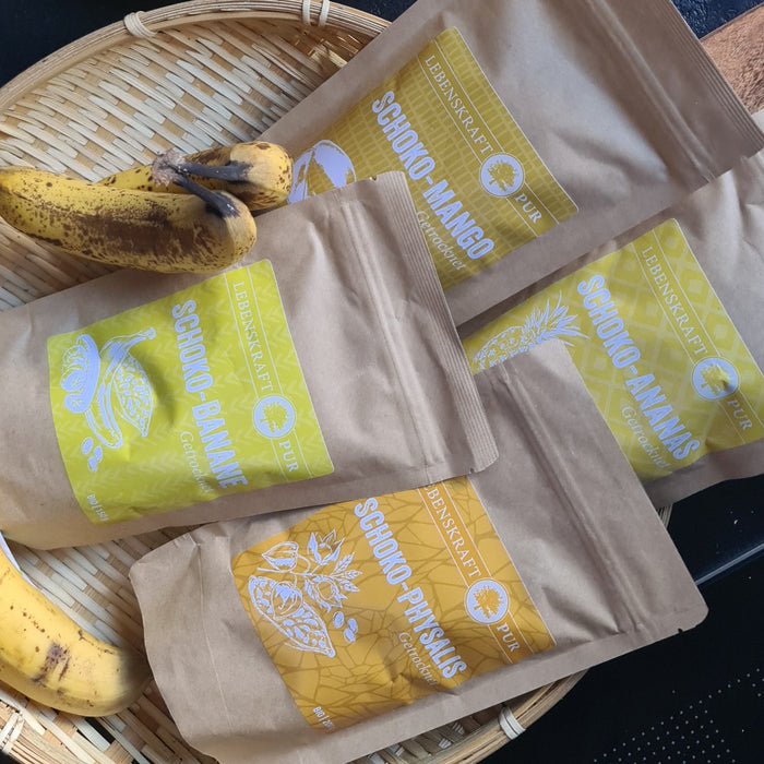 Die Schokofrüchte sind einfach nur köstlich und die beste Nascherei. Mein Favorit sind die Schokobananen, sie kommen bei mir bei jeder Lebenskraftpur Bestellung in meinen Warenkorb. Es gibt aber auch noch andere leckere Schokofrüchte wie Mango, Ananas oder Physalis.