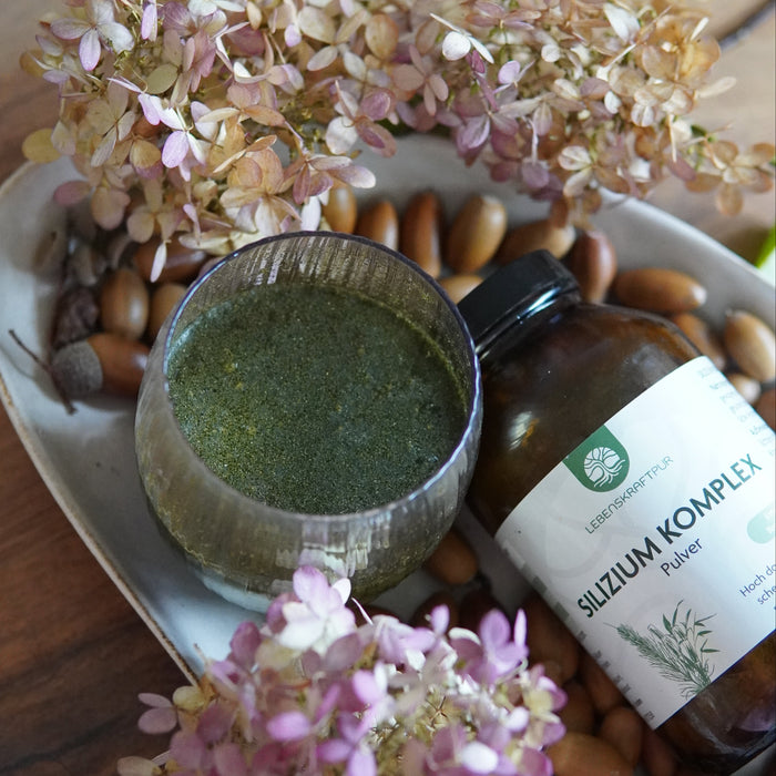 Silizium aus Ackerschachtelhalm und Brennnessel zum einrühren in Wasser, Smoothies oder Gerichten.