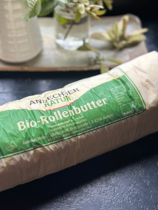 Rollenbutter und Milchprodukte von Andechser nature. Seit dem Stiftung Warentest Erdölrückstände durch die Verpackung in Butter gefunden hat bestelle ich immer die große Butterrolle. Sie ist in Pergamentpapier verpackt. Aus der Butter mache ich Butterschmalz und friere einen Teil ein. Zudem bestelle ich auch immer gleich Käse, Quark, Sahne und Joghurt mit.