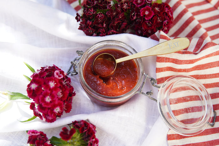 Tomaten-Ketchup mit Honig gesüßt. Bestell auch gleich ein Olivenöl mit ;-).