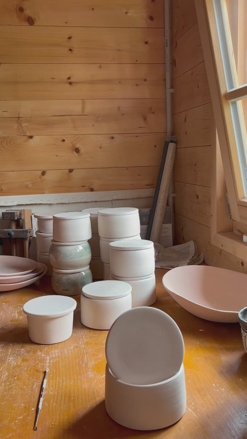 Jede Butterdose entsteht in München in einer Ein-Frau-Werkstatt – von Esmas Schwester handgedreht, glasiert und im Hochbrand aus Steinzeugton gebrannt. Es werden geprüfte, lebensmittelsichere Glasuren verwendet.